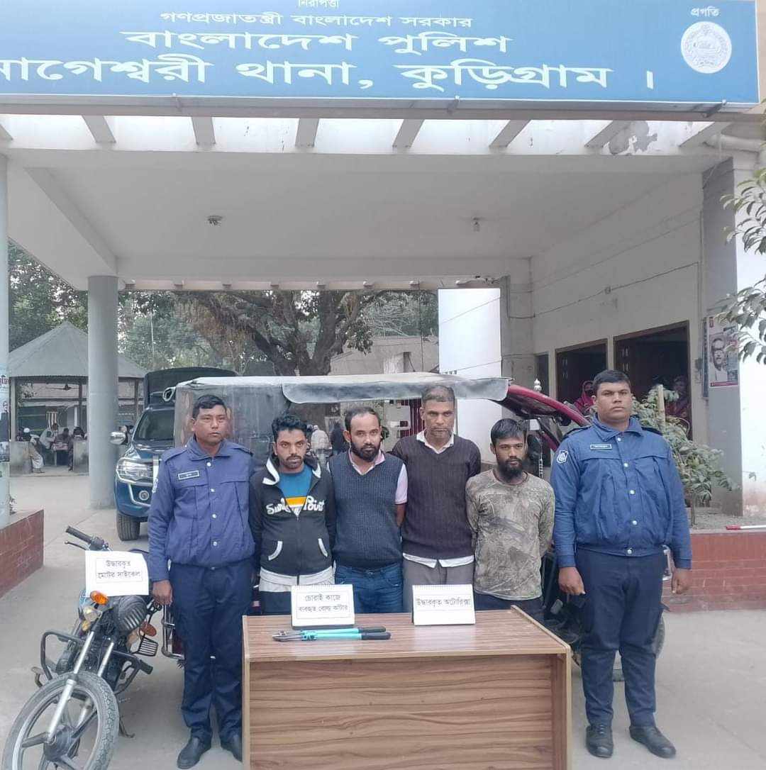 কুড়িগ্রাম জেলার নাগেশ্বরী থানা পুলিশের একটি টিম গত ২৬ জানুয়ারি ২০২৪ রাত আনুমানিক ০৩.৪৫ ঘটিকার সময় ভূরুঙ্গামারী থানা এলাকা থেকে একটি অটো চুরি করে নাগেশ্বরীর দিকে যাওয়ার সময় নাগেশ্বরী থানাধীন ভূরুঙ্গামারী হতে নাগেশ্বরী গামী বাঁশতলা নামক স্থান থেকে একটি ব্যাটারি চালিত অটো রিকশা তল্লাশি করে যাত্রীবেশে থাকা অটোচোর চক্রের কাছ থেকে চুরির কাজে ব্যবহৃত একটি বোল্ট কাঁটার ও চোরাই অটো এবং একটি চোরাই মোটরসাইকেল উদ্ধারসহ আরাজী পাইকেরছড়া গ্রামের মোঃ জরিপ উদ্দিন (২৭), দেওয়ানের খামার এলাকার মোঃ শাহীন আলম (২৮), মোঃ আসাদুল হক (৩৬), ছোট খাটামারী গ্রামের মোঃ মফিজুল ইসলাম (৪০) দেরকে গ্রেফতার করে পুলিশ।