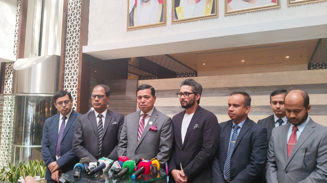সংবাদ সম্মেলনে এমভি আবদুল্লাহ প্রসঙ্গে কথা বলছেন কেএআরএম গ্রুপের ডেপুটি ম্যানেজিং ডিরেক্টর শাহরিয়ার জামান , আমিরাতে নিযুক্ত বাংলাদেশের রাষ্ট্রদূত মোহাম্মদ আবু জাফর সহ অন্যান্যরা। ছবি: ডেইলি মেসেঞ্জার